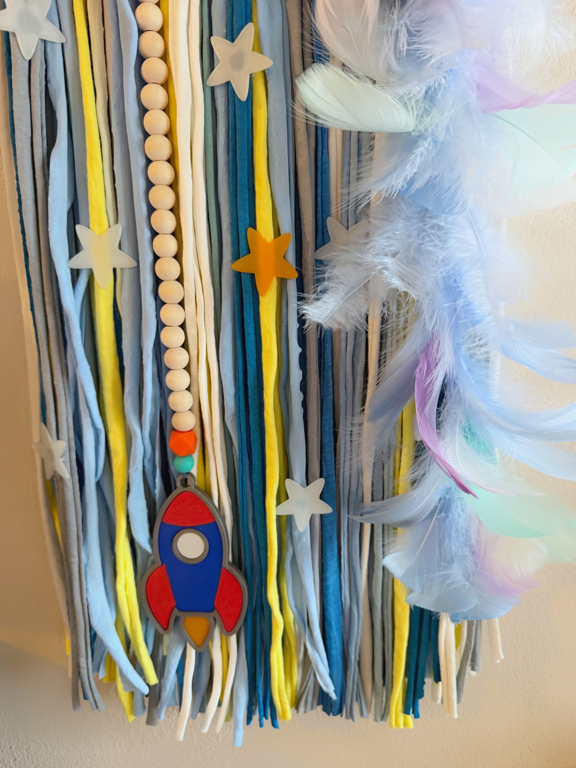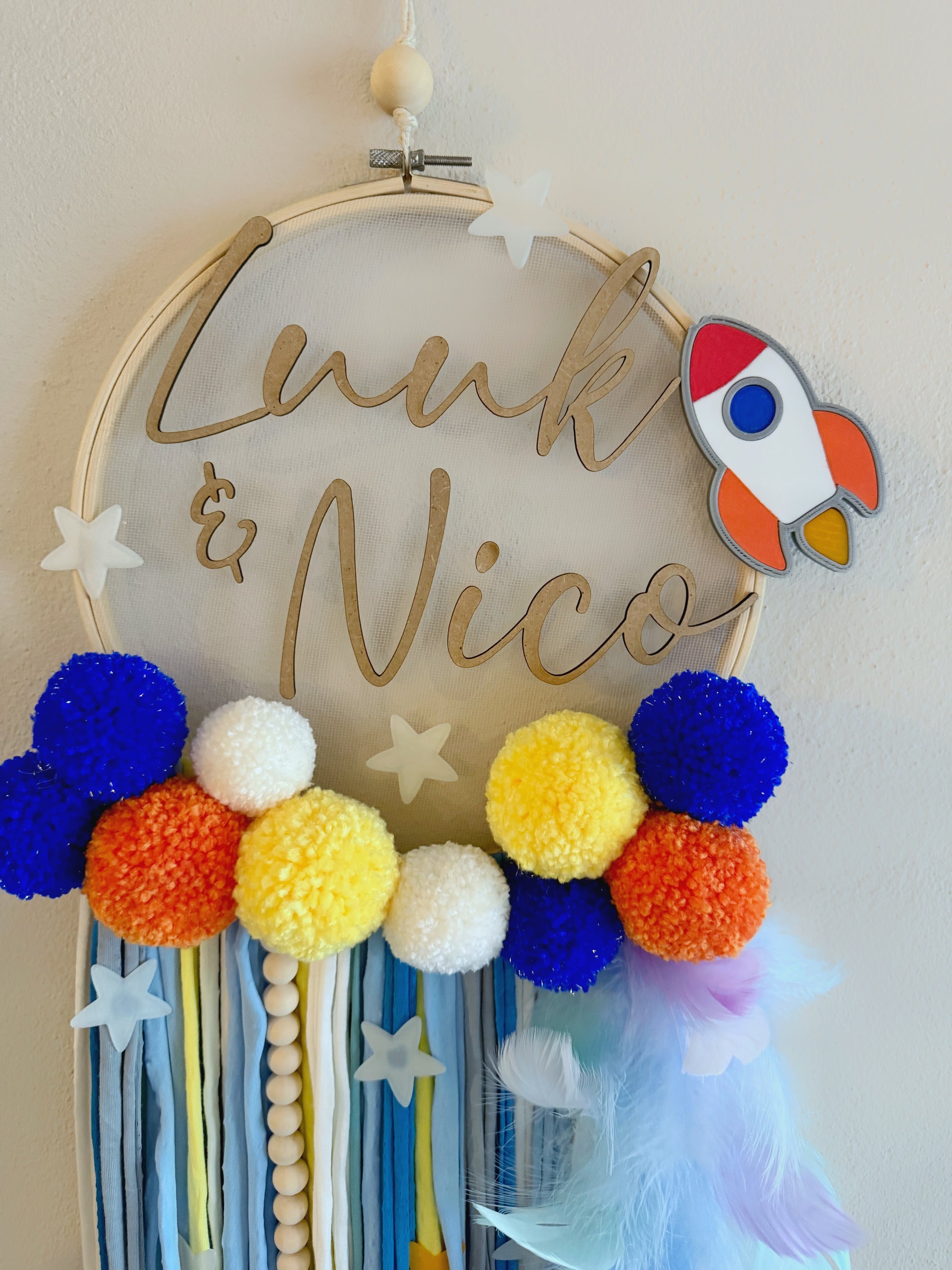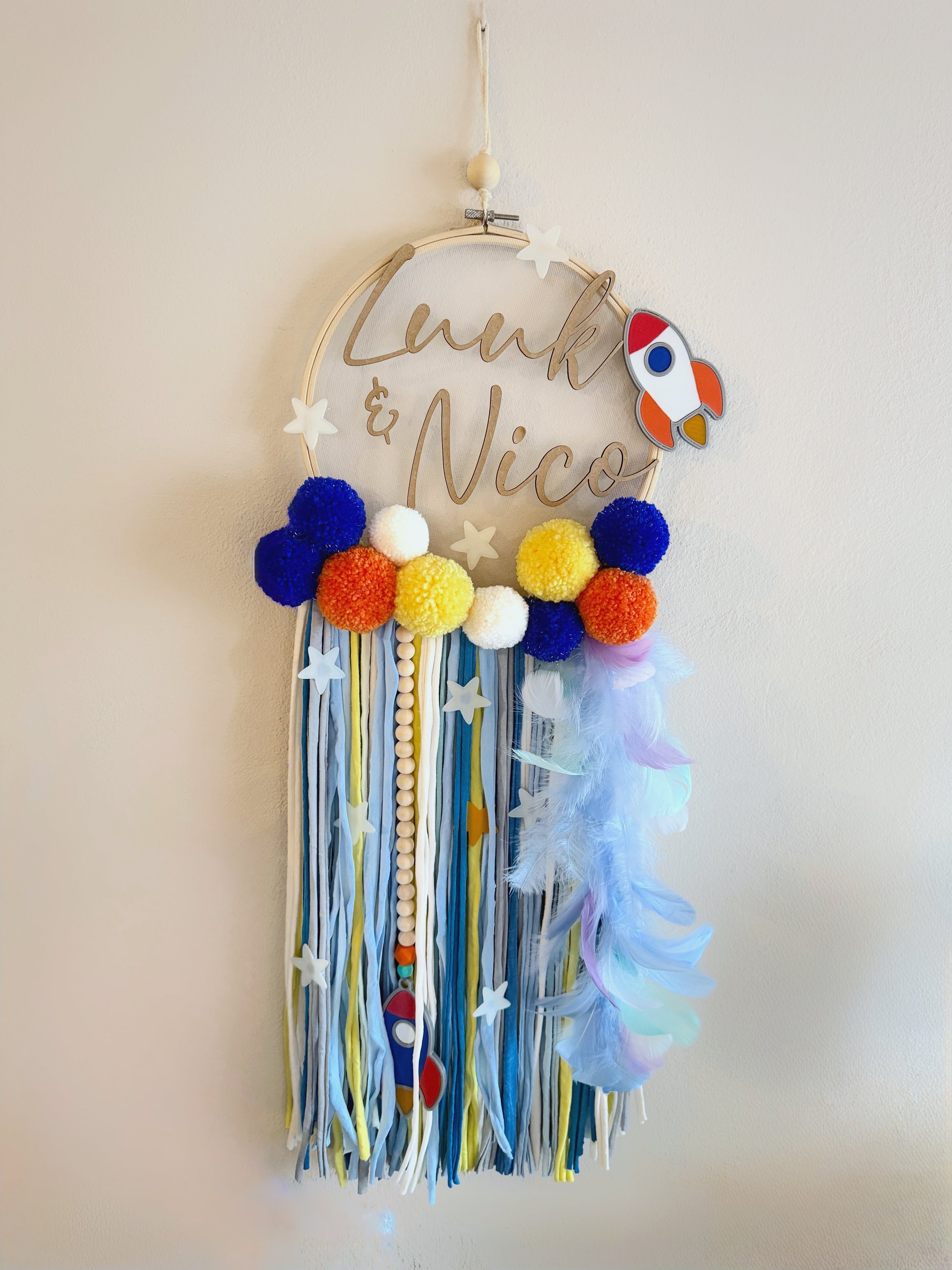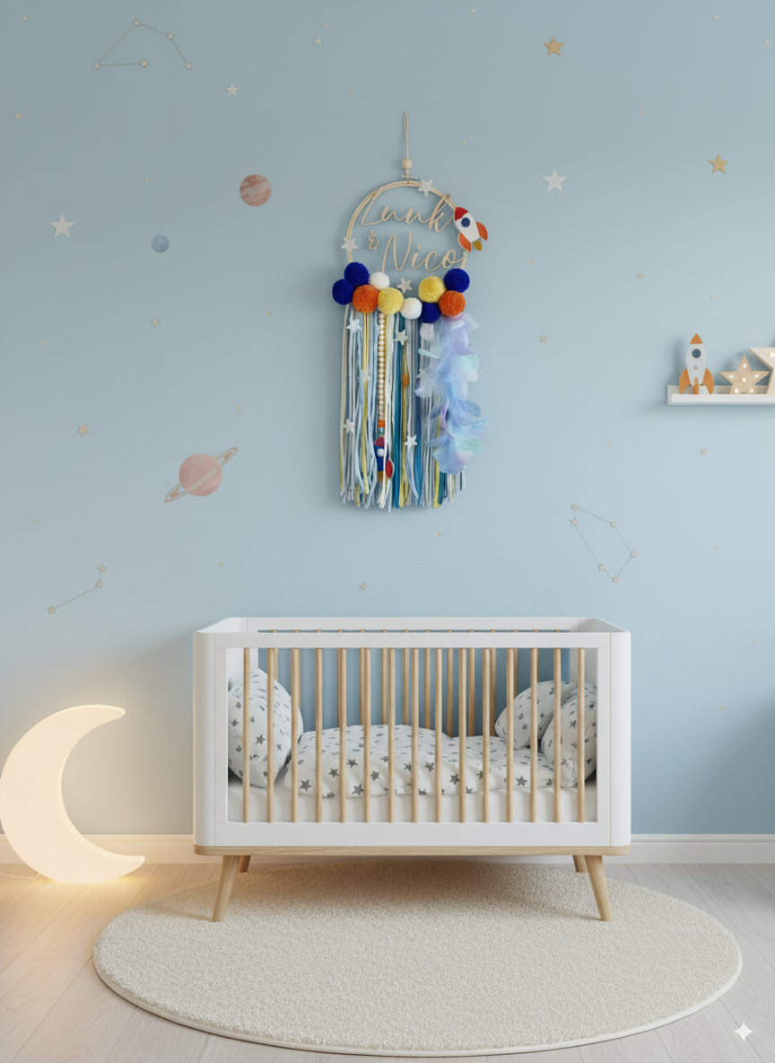 Un atrapasueños lleno de color y aventuras, diseñado para pequeños exploradores. Con cohete, estrellas y pompones en tonos vivos, será el detalle perfecto para dar un toque original y divertido a la habitación de tu peque.