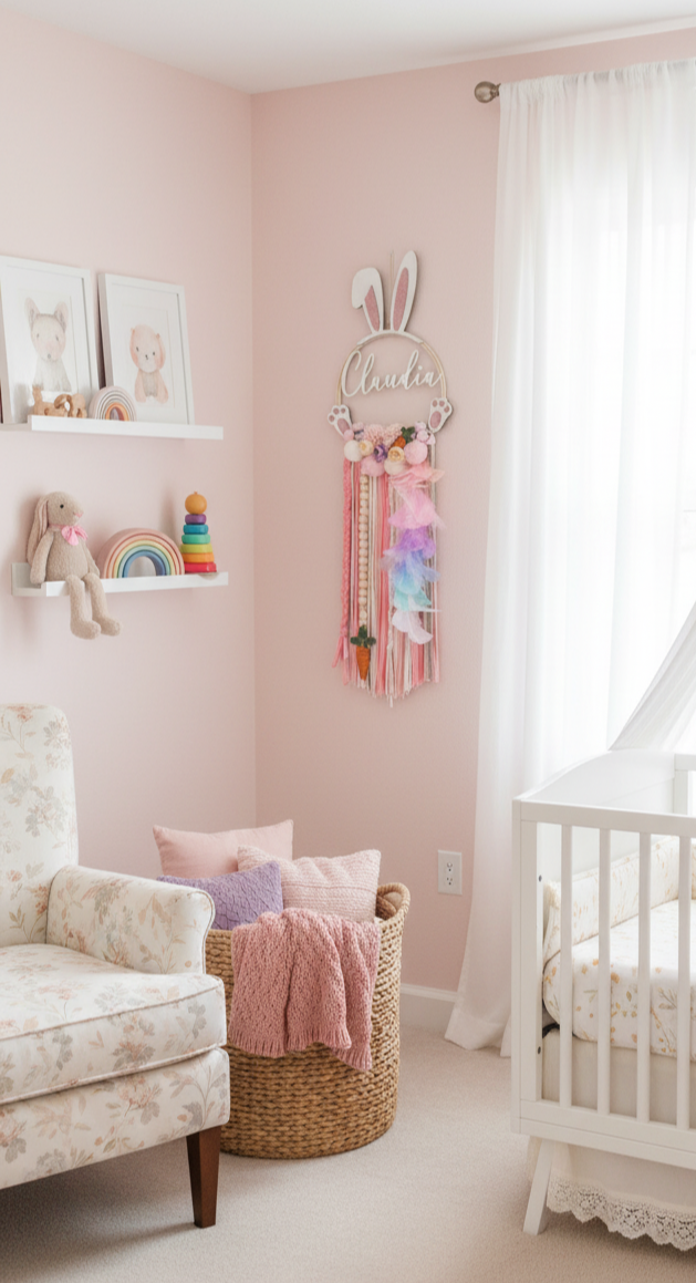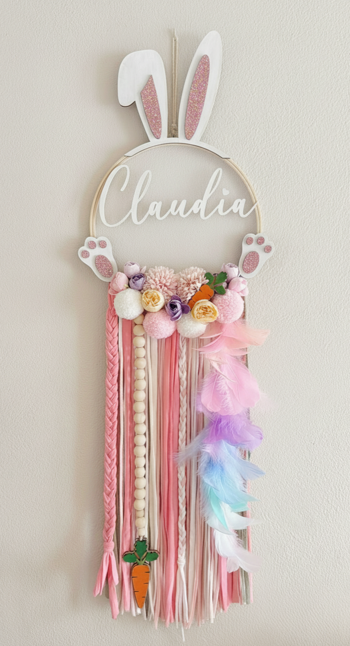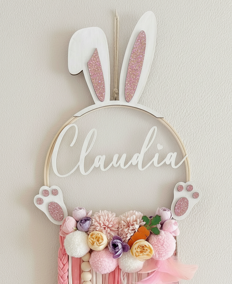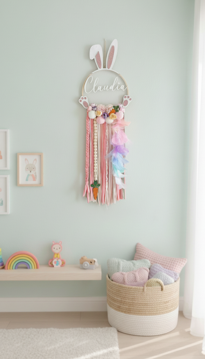 Nuestro atrapasueños Conejita es un detalle único, lleno de ternura y fantasía. Hecho a mano con orejitas y patitas brillantes, pompones de lana, flores y plumas suaves, es perfecto para decorar la habitación infantil y acompañar dulces sueños.