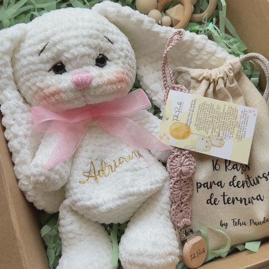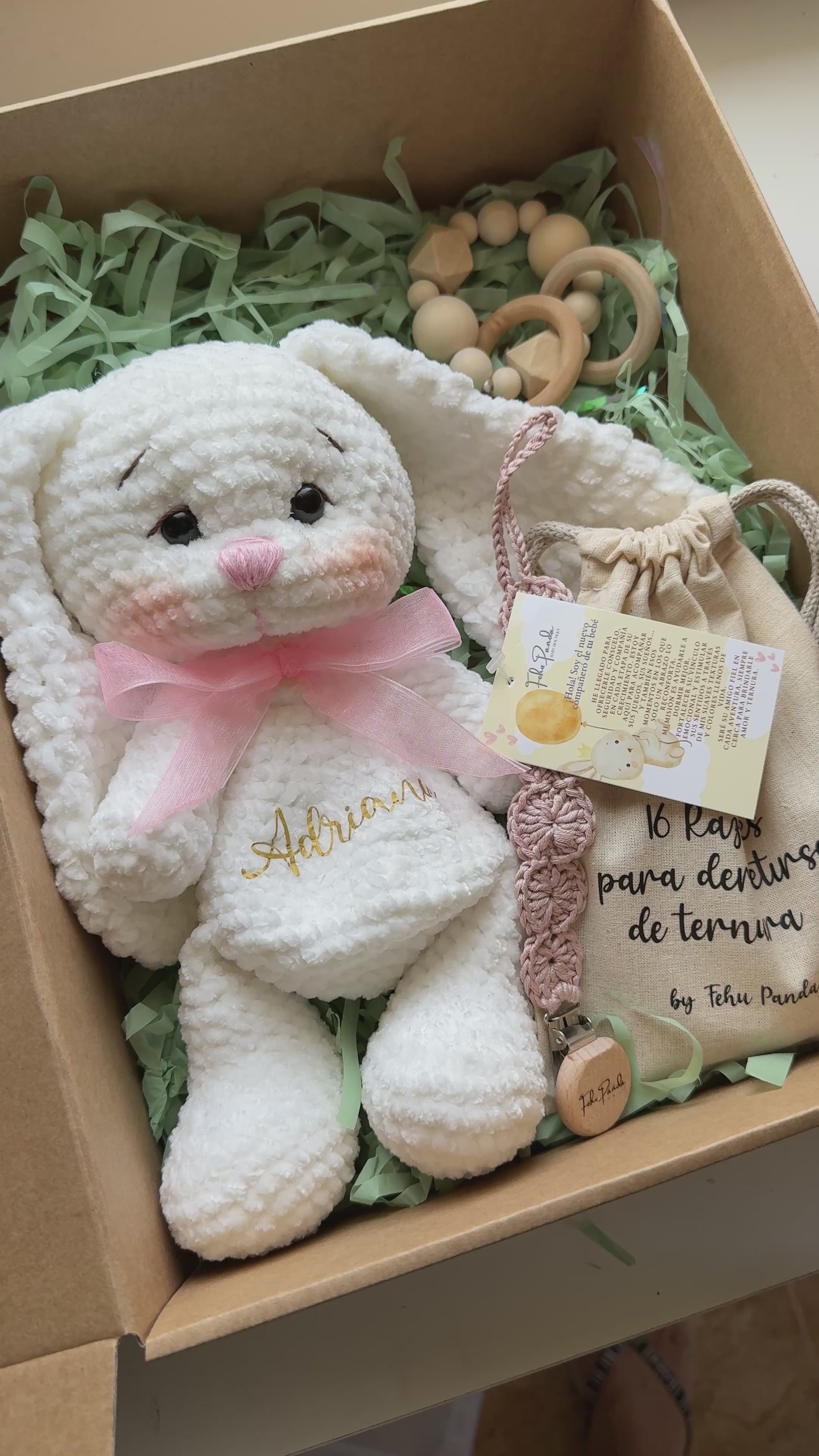 -Conejita tejida a mano. Con opción a personalizarlo con el nombre del bebé estampado en su barriguita, convirtiéndolo en un recuerdo único.